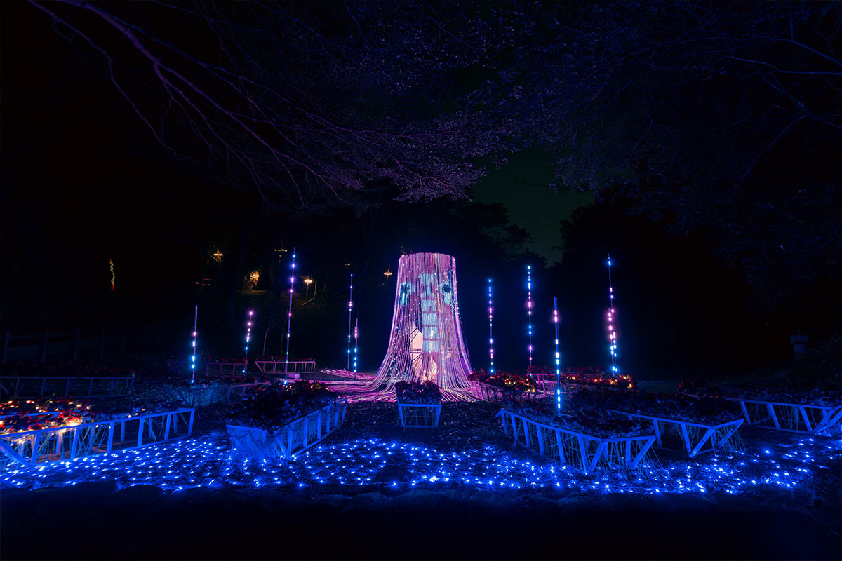 展覽動線順應虎形山高低起伏鋪陳,作品分布於入口、河谷、步道與觀景臺之間,透過光影與聲音彼此串聯,如同一首由微光漸入盛景的山林樂章。策展團隊表示,今年特別強調科技與自然的共生關係,讓光色在林間擴散、聲音如季節脈動般貼近觀者,使人在行走之中,不知不覺與大地一同甦醒。