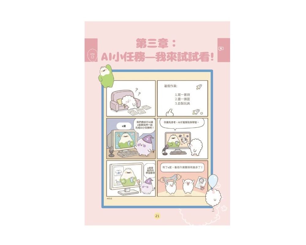 《我和AI一起學》從生活情境出發,以插畫與任務引導孩子操作生成式AI。