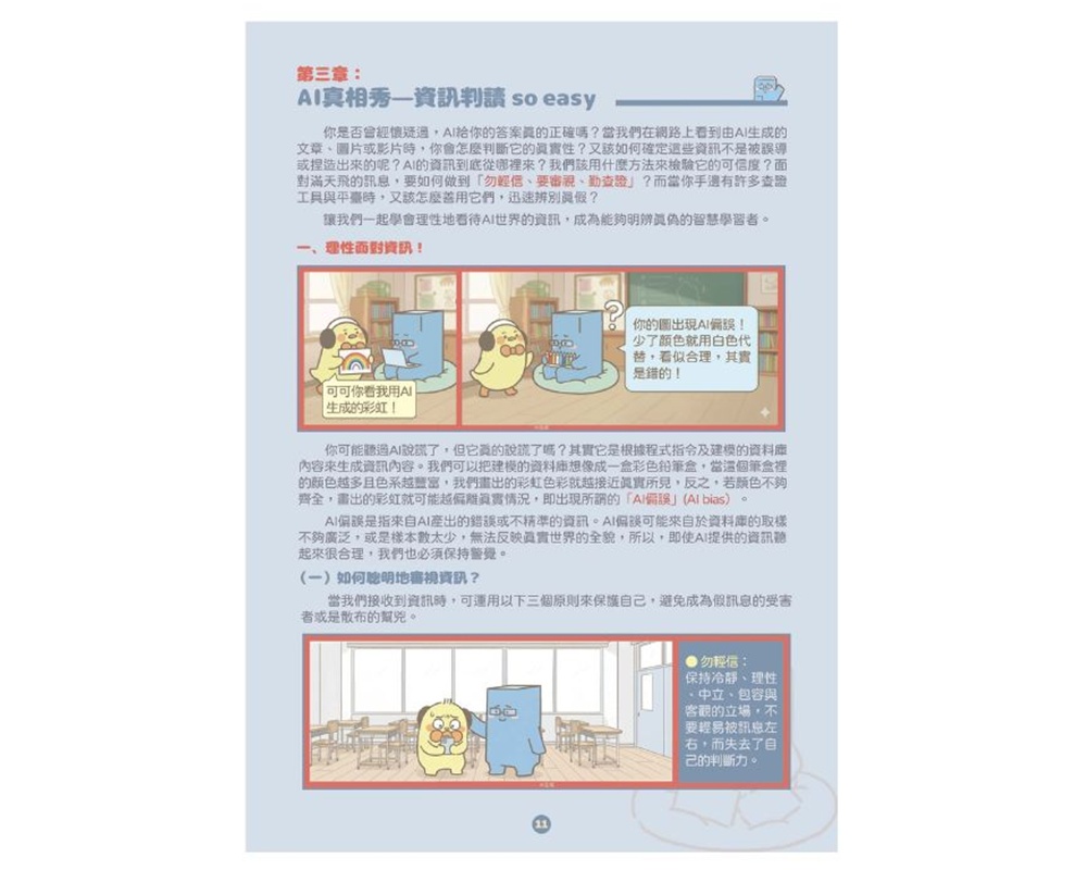 《駕馭AI,洞察未來:數位公民的必修課》則陪伴青少年走向更深層的理解。從資訊真偽、媒體識讀,到智慧財產權與隱私安全,手冊引導青少年建立穩定的價值判斷,養成「先求證、再分享」的數位素養。科技愈強大,責任也愈重要,懂得安全、正確地使用AI,正是未來公民的關鍵能力。