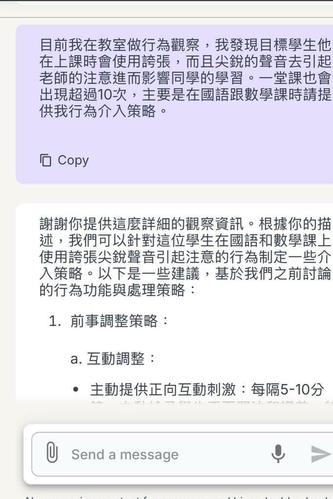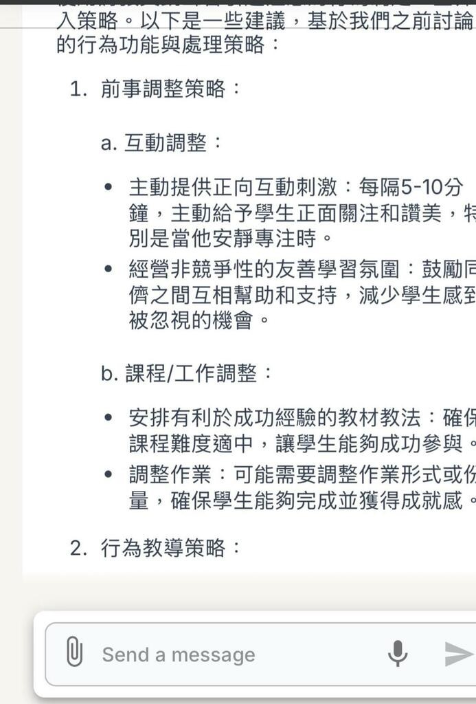 在進行學生行為觀察時,可以透過手機啟用Magic School的行為介入機器人,以語音輸入方式記錄觀察到的目標行為、發生的時間、地點及頻率。根據事先提供的行為介入架構與策略,機器人能快速生成符合規範的建議方案,作為後續介入的參考。