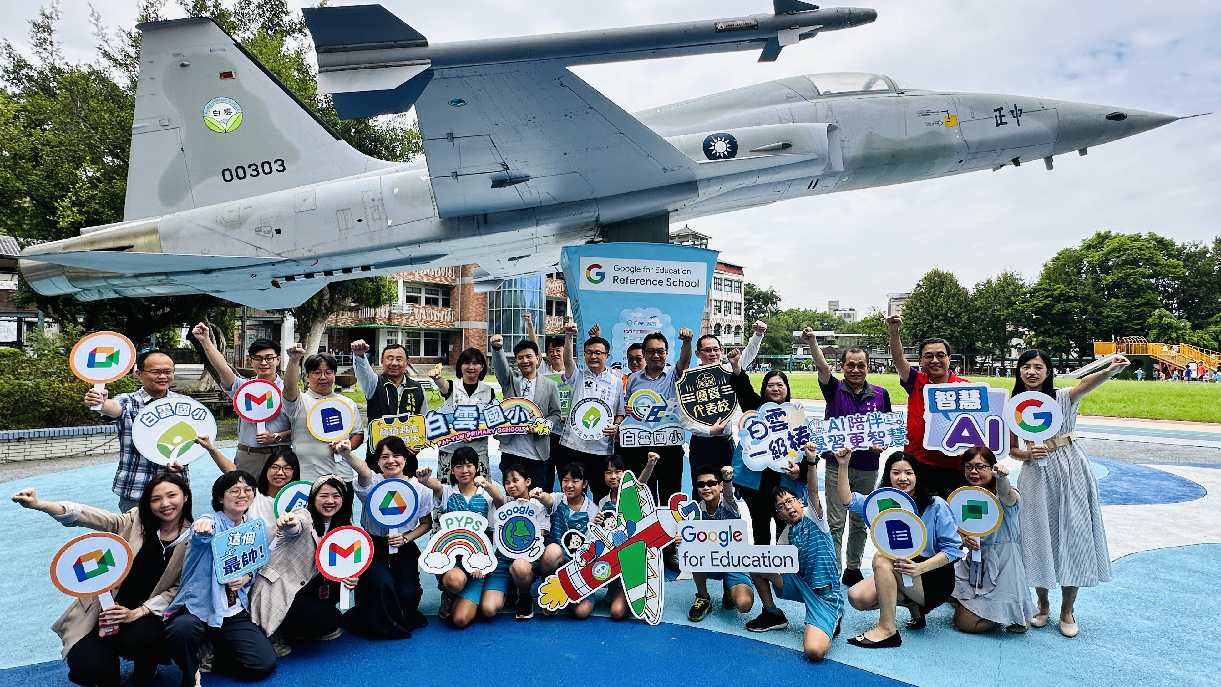 全臺唯一在校園內擁有F-5E戰機、以「白雲飛行學院」課程聞名的新北市白雲國小,榮獲 Google Reference School國際認證!成為新北市第二所、全國第六所獲得此殊榮的小學。透過全面導入Google教育工具並結合AI科技,該校成功提升教學效能與學習深度,讓學生從學習者轉變為創作者。