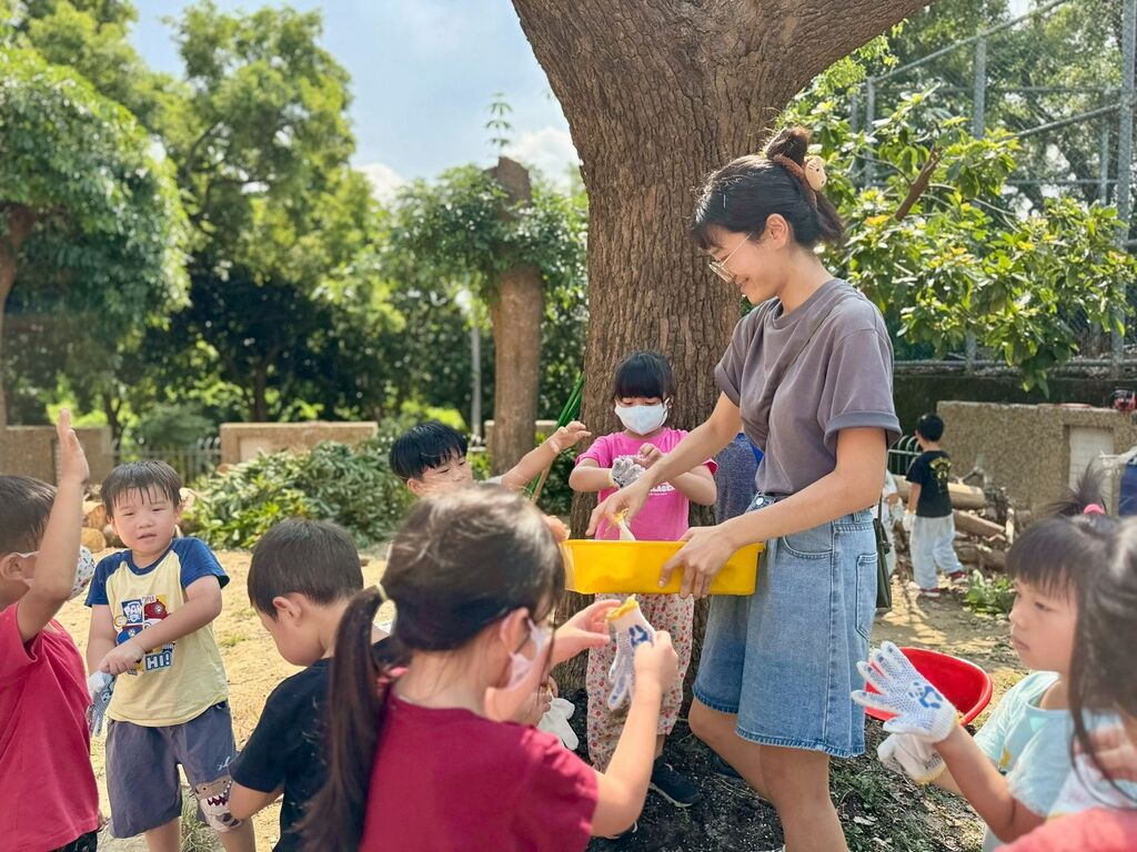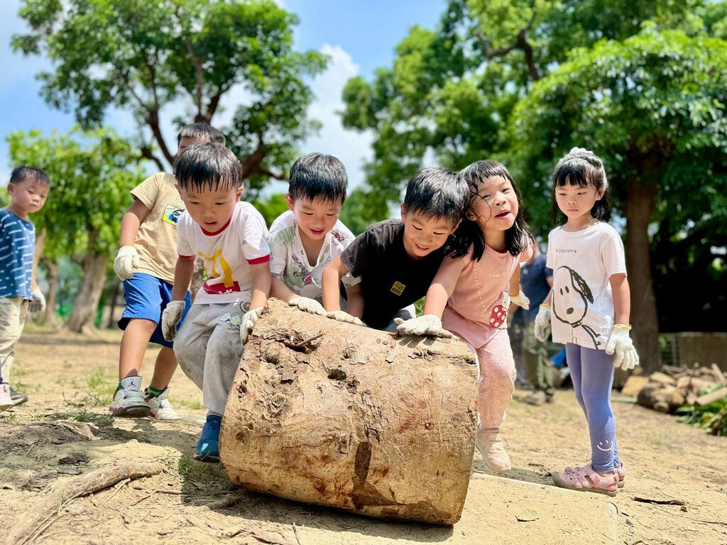 當最後一塊樹幹穩穩立起時,酪梨大碗的修復工程也宣告完成。看著嶄新的大碗,師生們都洋溢著成就感與喜悅。幼生梁里齊說:「我和好朋友一起推大木頭,推到大碗旁邊再翻起來,我的力氣很大。」幼生王丞佑說:「我看到很多雞母蟲,總共有14隻、都很大隻。」關新蓓老師說:「梅花鹿班孩子再次出校園任務,此次任務為升級酪梨大碗,將小班製作的酪梨大碗重新改造,孩子們分工合作,大家有條理的搬運,不僅是學習團隊合作,更是一堂生命教育課程,孩子們發現居住在大碗裡的居民,大家小心讓路避免影響小動物的行動。」