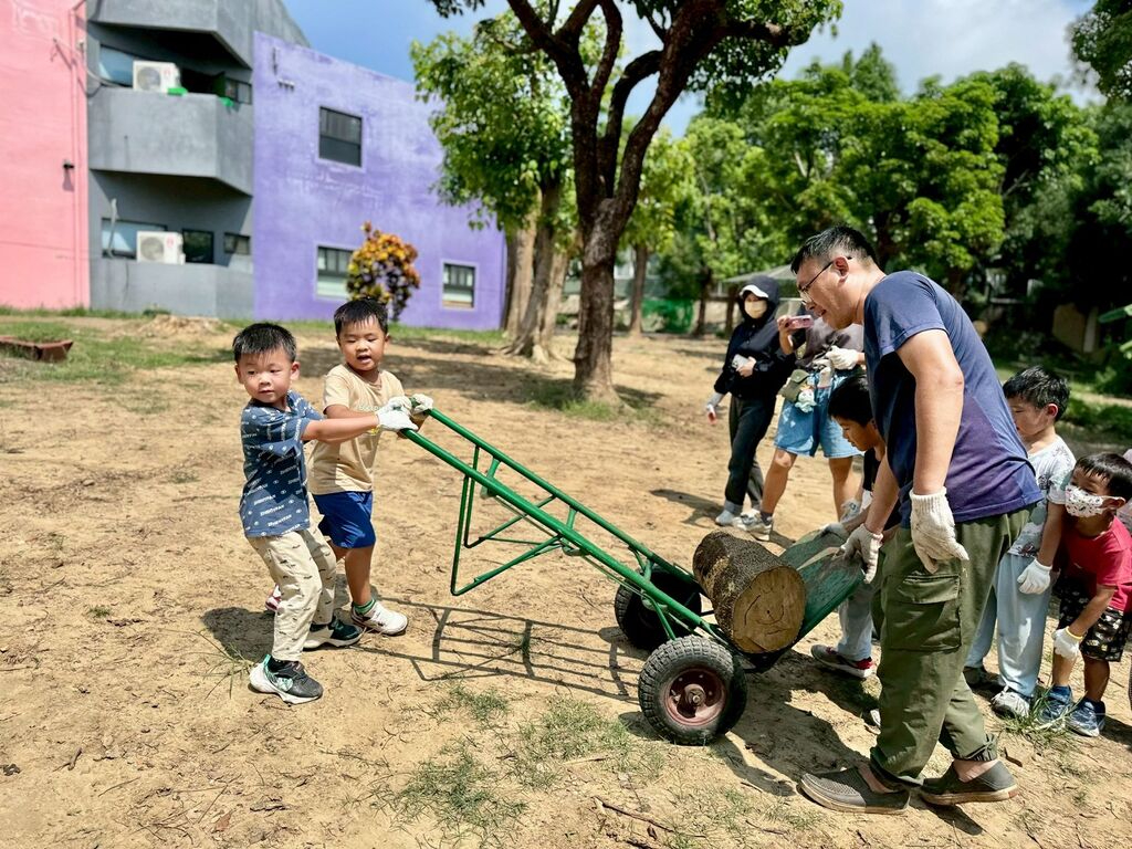 孩子們同心協力,將大塊樹幹用推車移至新大碗的預定位置。