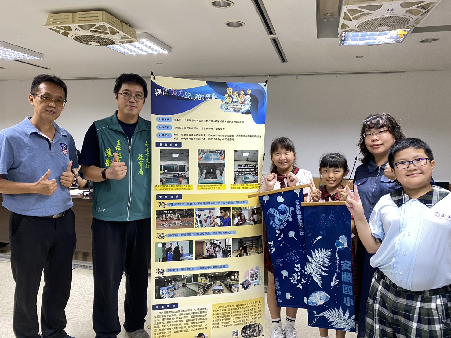 東陽國小以「We『Art』Dong Yang」為主題,學生透過繪畫、陶藝、紙漿雕塑等媒材美化校園階梯、牆面與轉角,並結合在地蜈蚣陣文化,展現地方特色;安順國小則將舊自然教室改造成「藝美教室」,從洗手槽到牆面都充滿藝術巧思,並結合校本課程「安順囡仔玩(僧)臺江」,學生運用藍晒技法創作掛旗與掛畫,讓在地文化成為教室的主角。