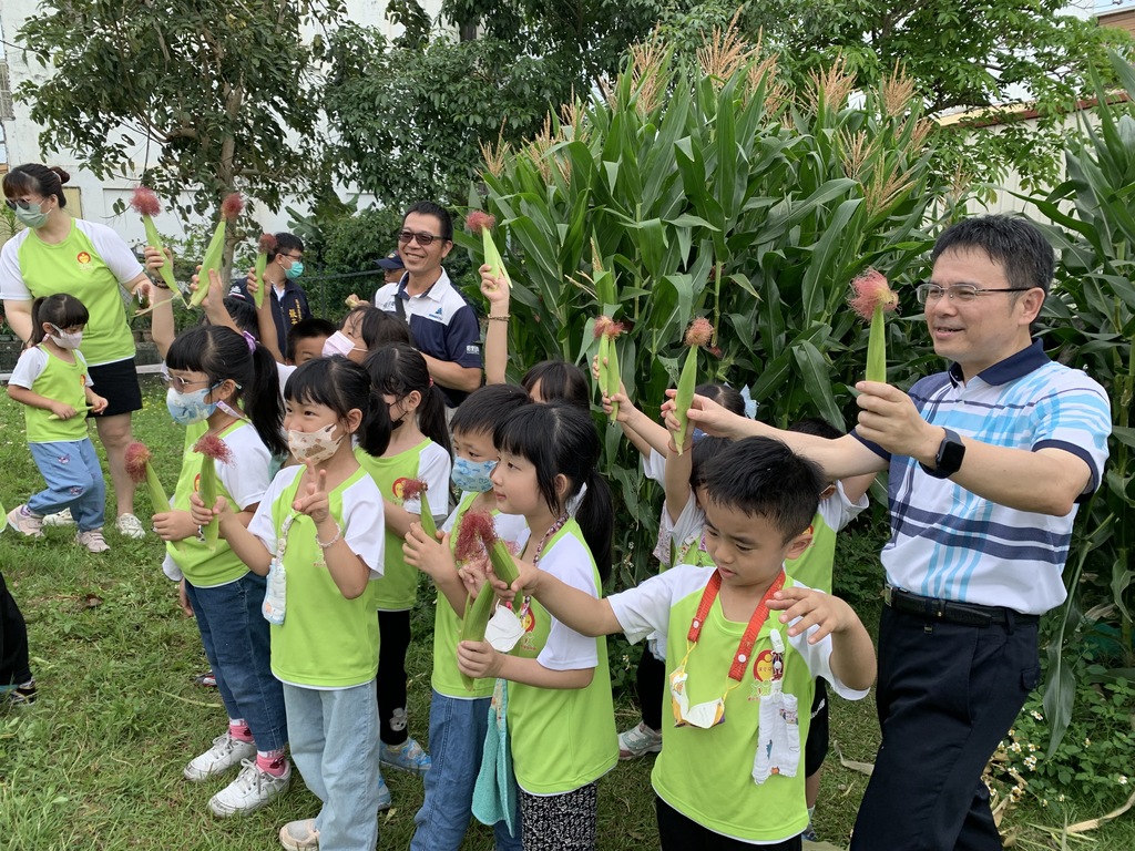 校長和幼兒園小朋友一起體會採摘玉米筍的樂趣。