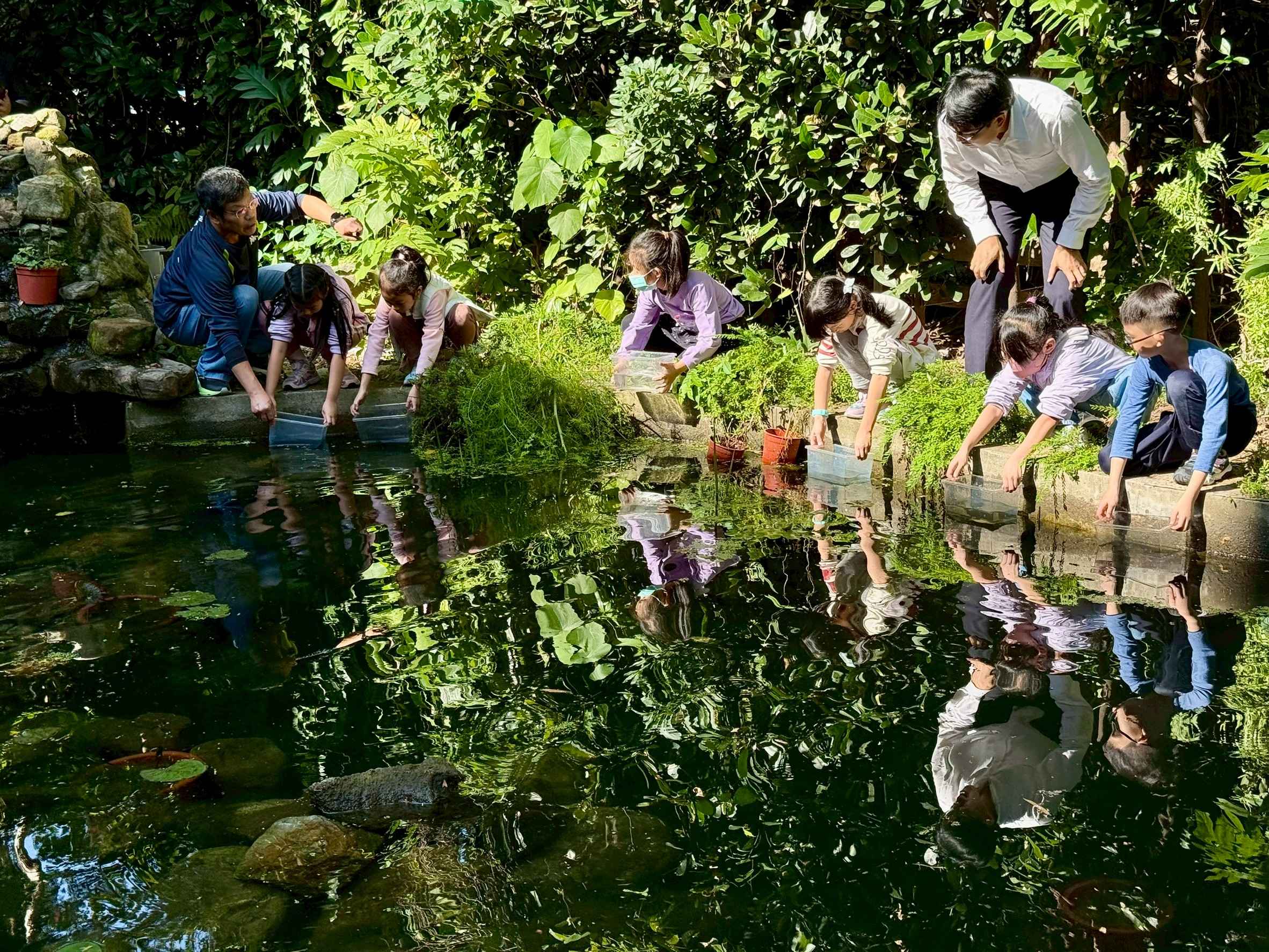 銘傳國小師生共同將瀕危的臺灣原生種「史尼氏小䰾」放養至校園生態池。