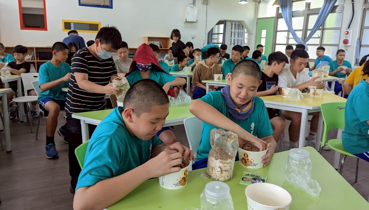 每次拿出這些材料,教室裡總響起驚呼。「老師,這好香喔!」「這個有巧克力味耶!」孩子們湊上前聞,發現竹屑、茶渣、咖啡渣、仙草渣都能孕育生命。第一次上課時,大家興奮又緊張,有人想多加咖啡渣,有人嫌瓶子太小,也有人想試竹葉或果殼。這些討論讓他們明白:所謂「廢棄物」也能再生,探索的過程正是在培養創造力與解決問題的能力。
