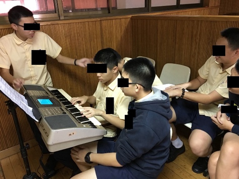 (圖二)學生分組練習團體合唱,搭配鋼琴伴奏。