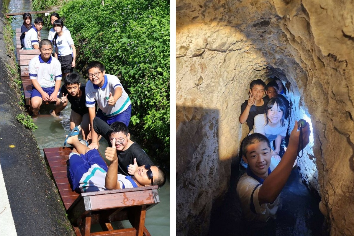 (左圖)學生在穿龍圳戲水。(右圖)學生進入穿龍圳發掘生態故事。