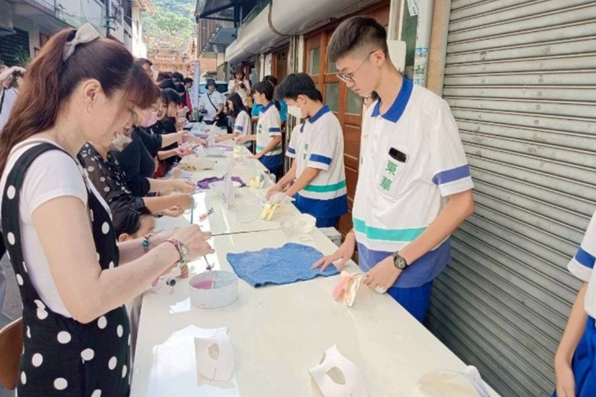 學生在龍神山水祭活動帶領居民與遊客彩繪四季大神臉譜。