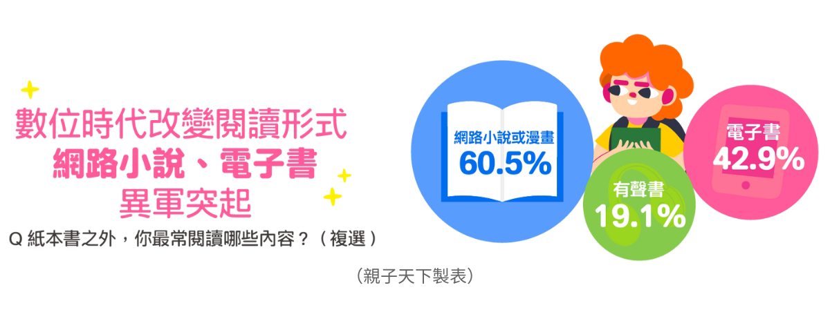 隨著科技發展,閱讀形式也跟著革新,現在的國中小學生除了閱讀紙本,也有高達60%學生會閱讀網路小說或漫畫,透過行動載具,點開他們的閱讀視窗。