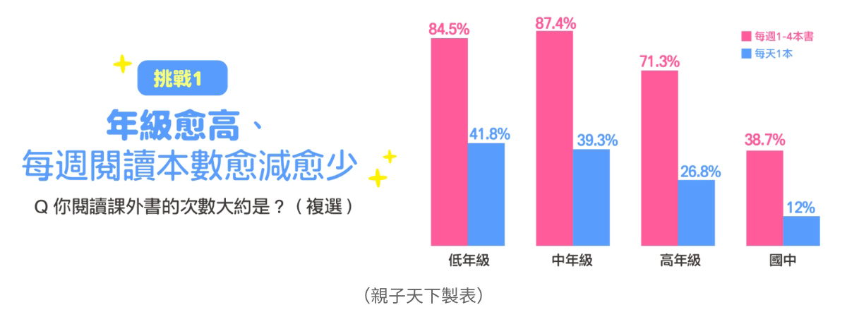 根據調查,有84.5%低年級學生每週會閱讀「1至4本書」,到了中年級族群雖有微幅略增,但一到高年級就僅約7成學生能維持相同的閱讀頻率。國中族群更少,每週閱讀「1至4本書」的比例僅不到四成(38.7%)。