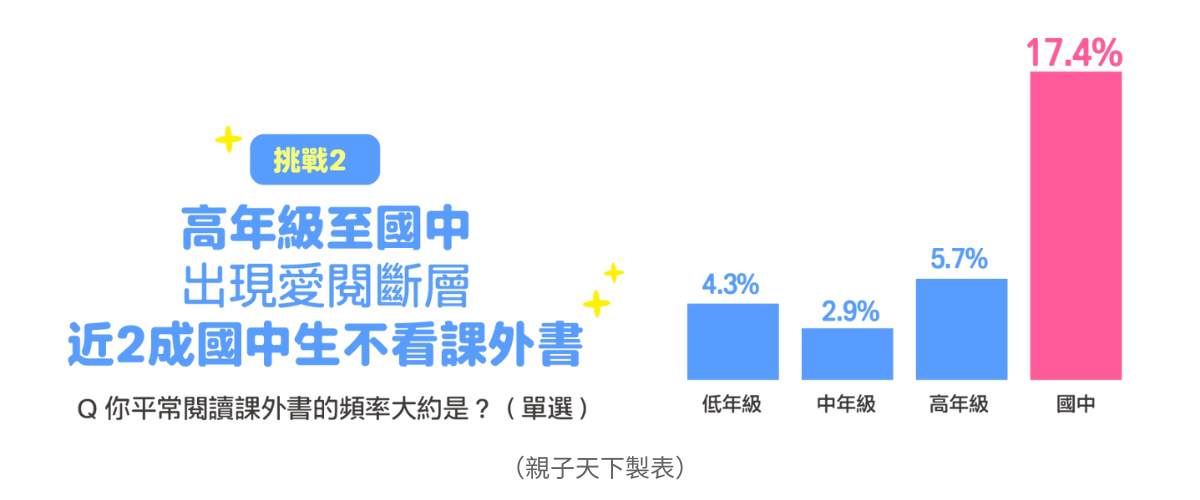 閱讀頻率下降不打緊,調查也發現,在國小高年級至國中階段,竟出現了「愛閱斷層」。國小不分年級,「幾乎不看書」的比例均不超過6%。但到了國中階段,有17.4%國中生回應自己閱讀課外書的頻率趨近於零。
