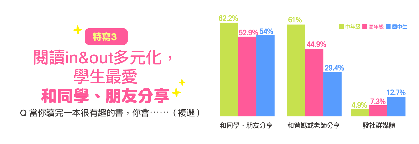 在本次調查中,當學生閱讀完一本很有趣的書時,學生普遍最愛和同學、朋友分享,和師長、爸媽分享則是次要選項。隨著年級愈高,愈愛將個人觀後感放在社群媒體,有12.7%國中生會這麼做。