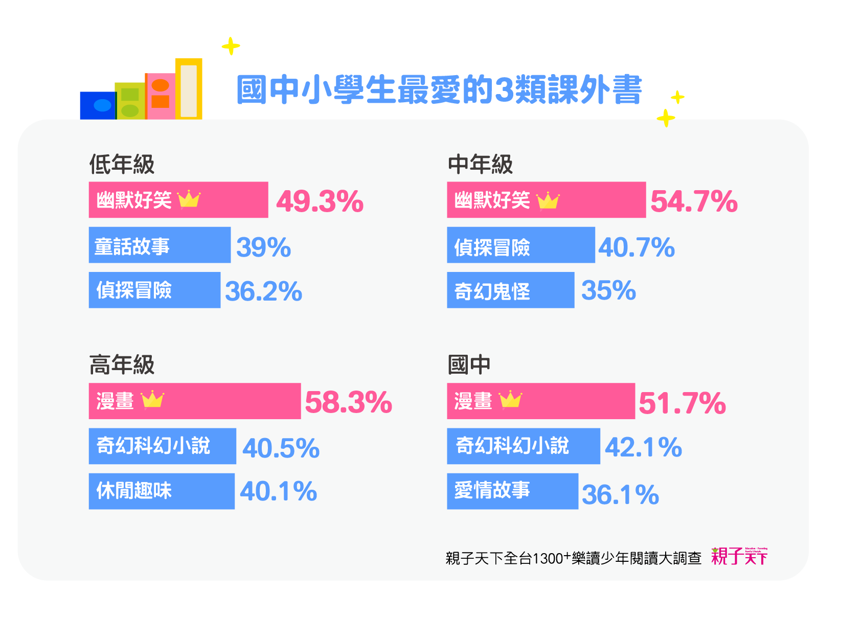 到了高年級,依序喜愛漫畫、奇幻科幻小說、休閒趣味;國中則依序是漫畫、奇幻科幻小說、愛情故事。值得一提的是,有近兩成國中生喜歡閱讀情緒與心理學的相關書籍。