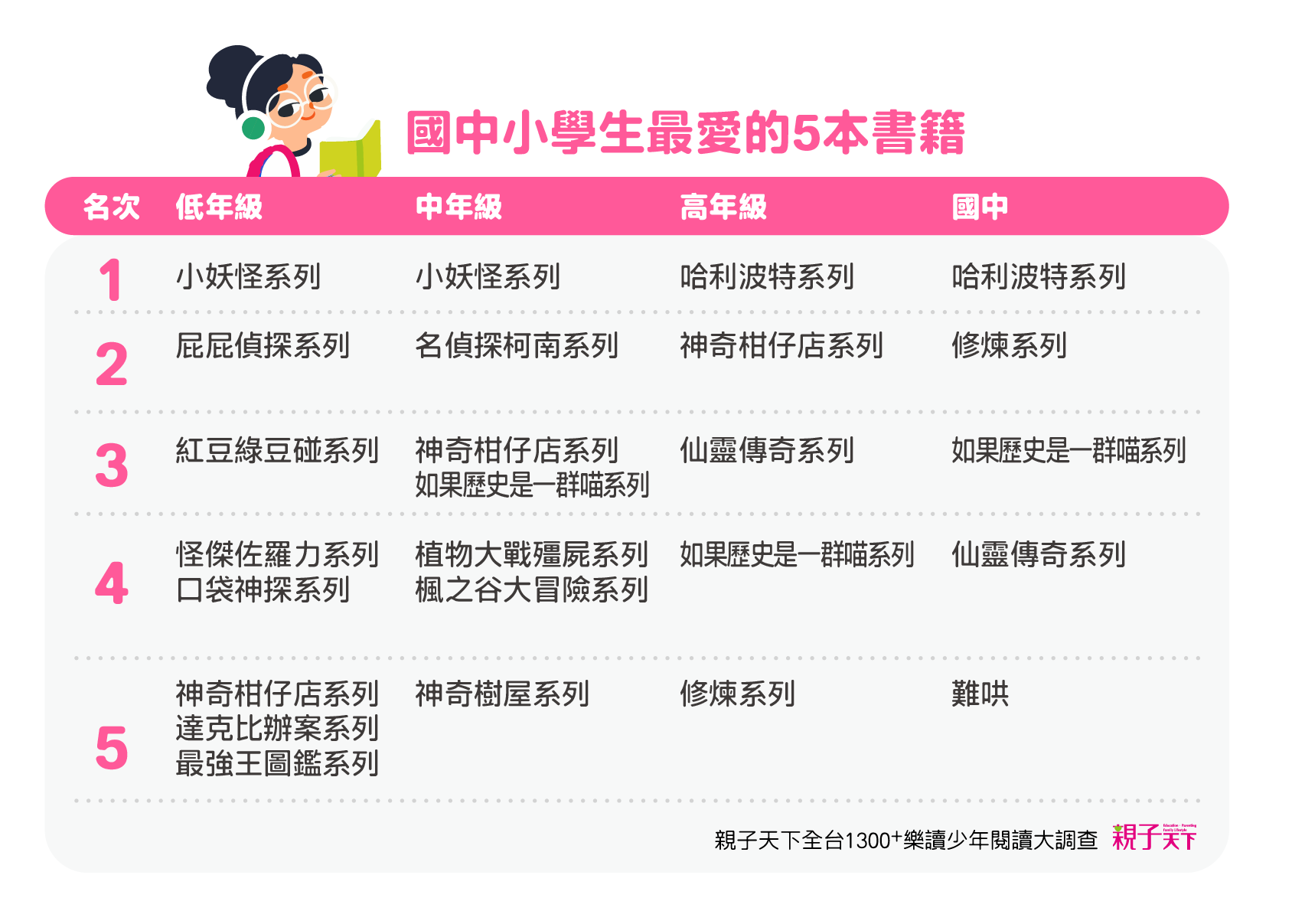 學生喜愛的閱讀類型,也反映在他們最愛的書籍與作者排行榜中。