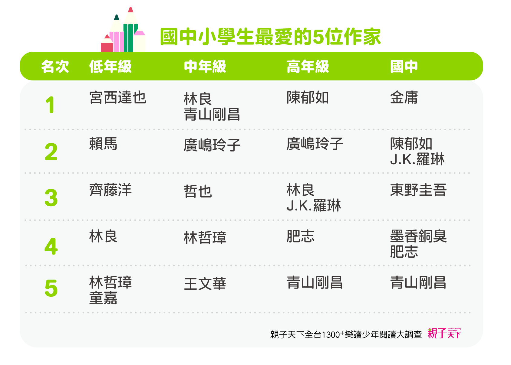 雖然這次調查,孩子最愛的書以翻譯作品居多,但問到作者,還是臺灣的作者最受歡迎。