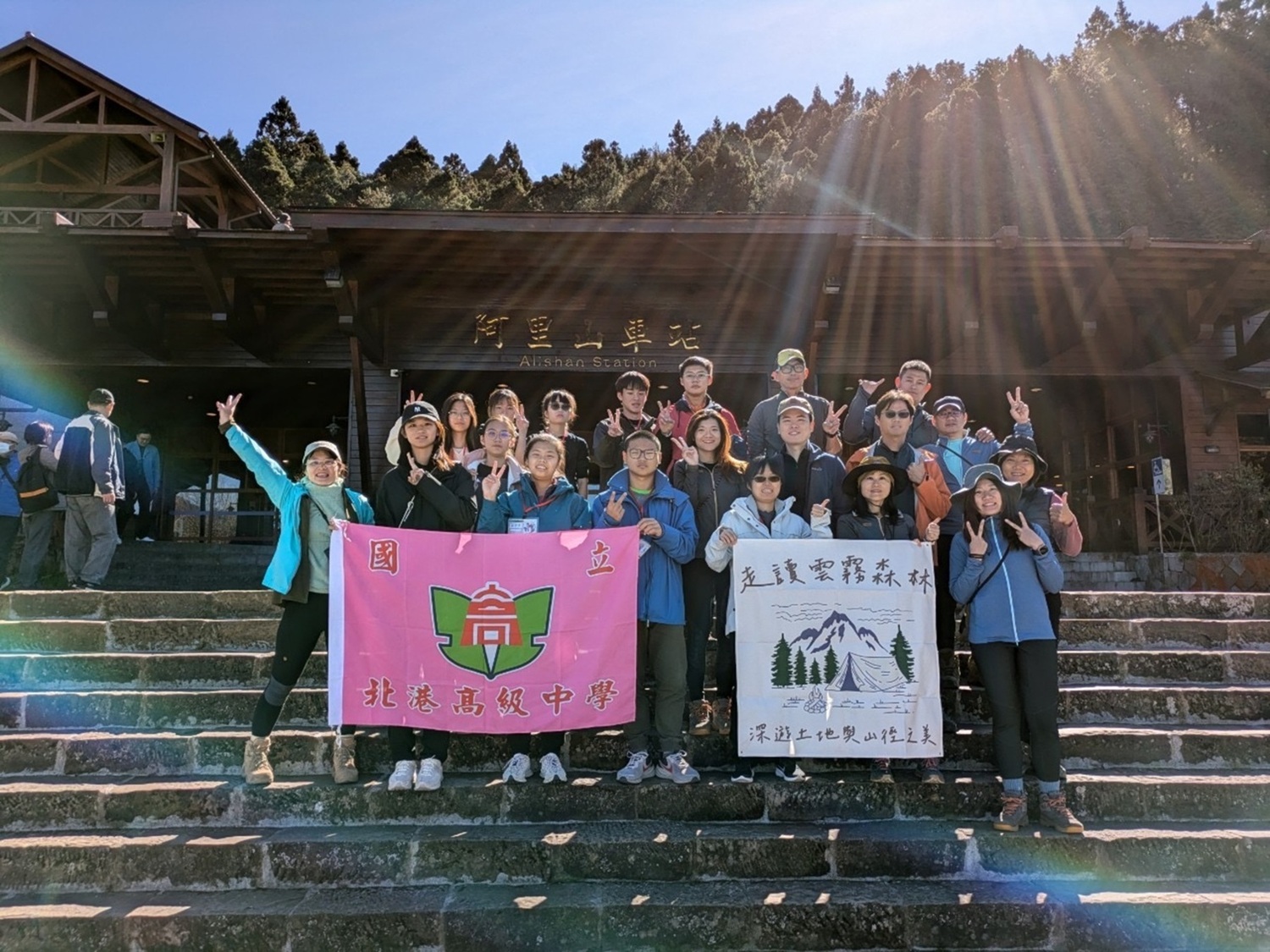 北港高中同學們前往眠月隧道前,在阿里山車站合照。