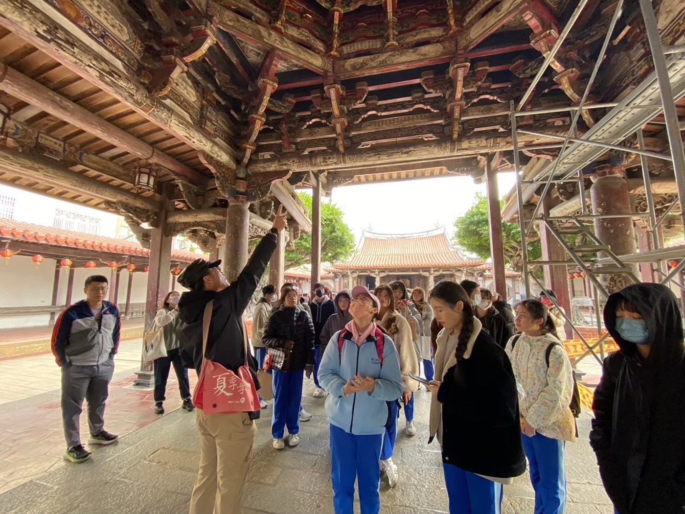 華南高商學生至鹿港龍山寺參觀八卦藻井。