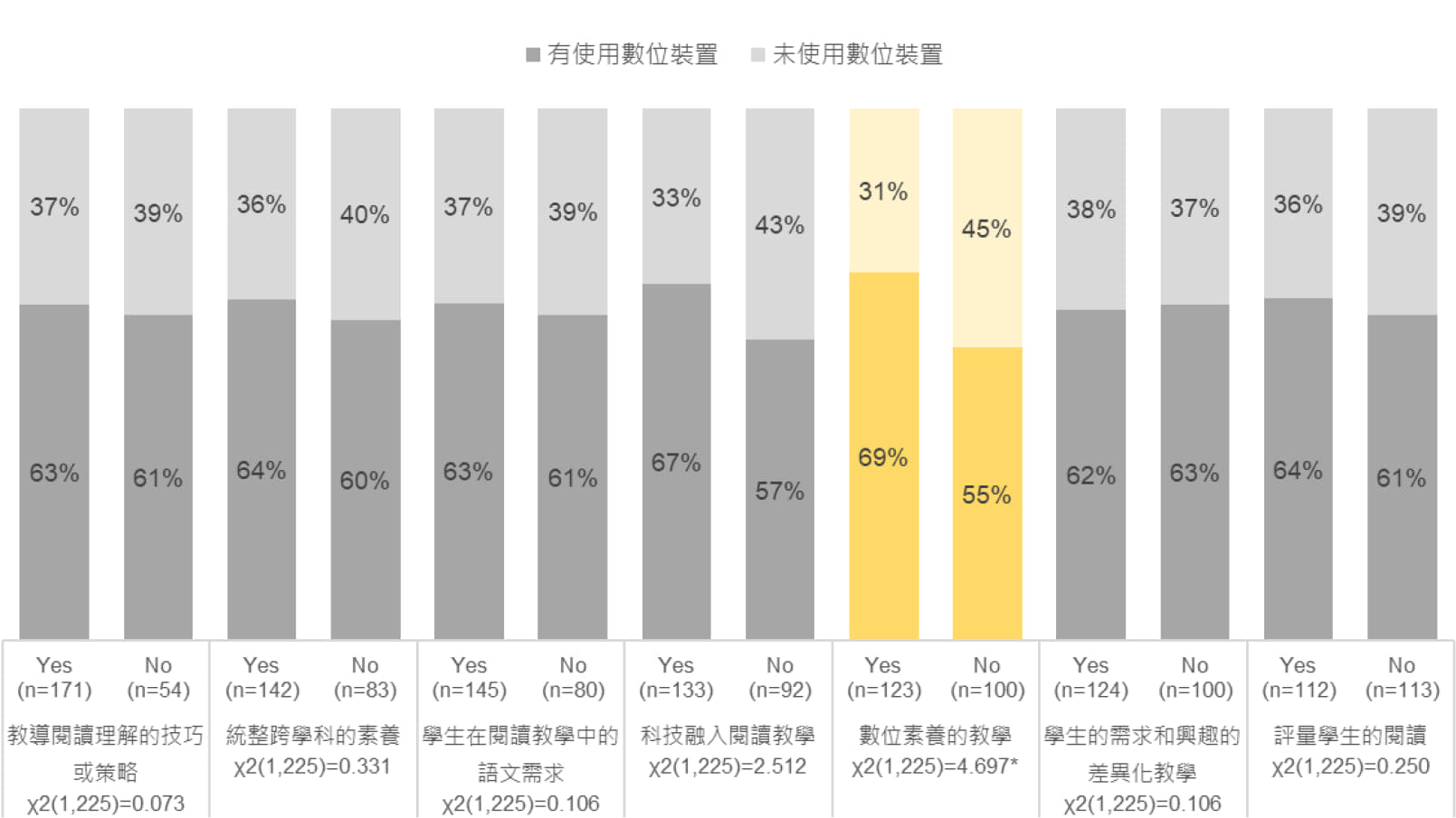 首先,先從瞭解教師背景與其是否使用數位載具進行閱讀教學間的關係開始。在分析PIRLS 2011、2016及2021年三屆學生閱讀表現與教師問卷資料後發現,教師的性別、年齡、教學年資與教育程度皆與其是否採用數位載具進行閱讀教學並無相關。此外,教師參與專業發展的時數與其是否使用數位載具進行閱讀教學均沒有相關;惟教師在近二年內曾參與和「數位素養的教學主題」相關的閱讀專業發展活動,例如工作坊、研討會、課堂教學研究等,與其有無採用數位載具進行閱讀教學是有顯著相關的。同時,在所有曾參與過與數位素養的教學主題相關之閱讀專業發展活動的教師中,有近七成的教師會採用數位載具進行閱讀教學。