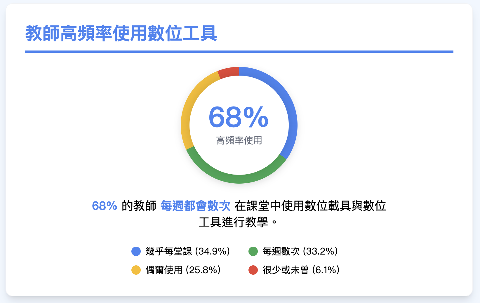 調查數據指出,數位教學已是現在進行式,約 68% 的教師每週都會數次在課堂中使用數位載具與數位工具進行教學,其中更有高達 35% 教師表示幾乎每日都會使用。