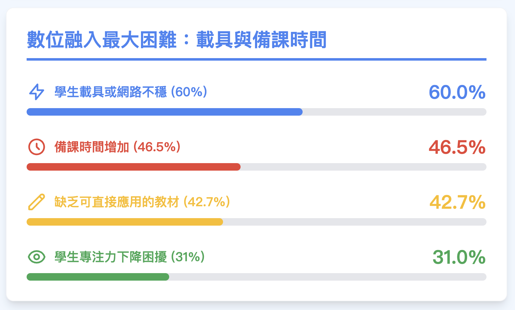 然而調查也揭示:硬體上線≠教學轉型完成。