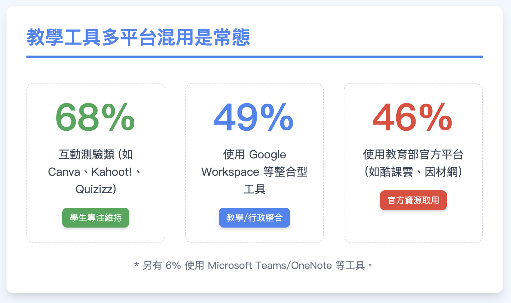 根據數位教學工具使用統計,教師們「多平臺混用」已是常態: