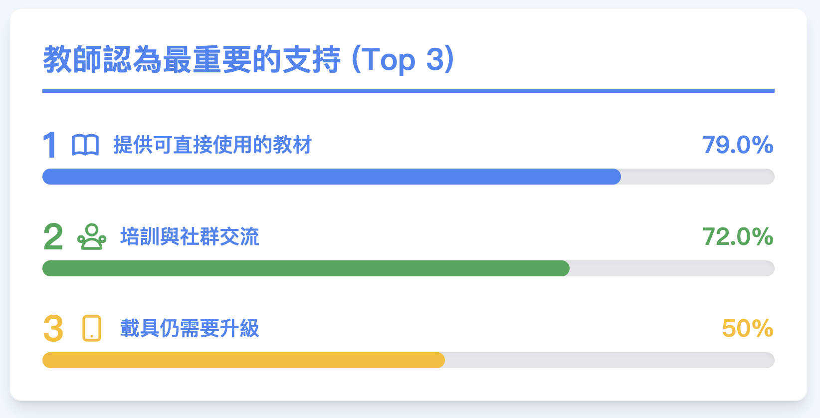 面對AI推動與數位轉型,79%教師認為最重要的支持是提供可直接使用的教材,也有72%教師期待更多培訓與社群交流,超過一半的教師認為載具仍需要升級。