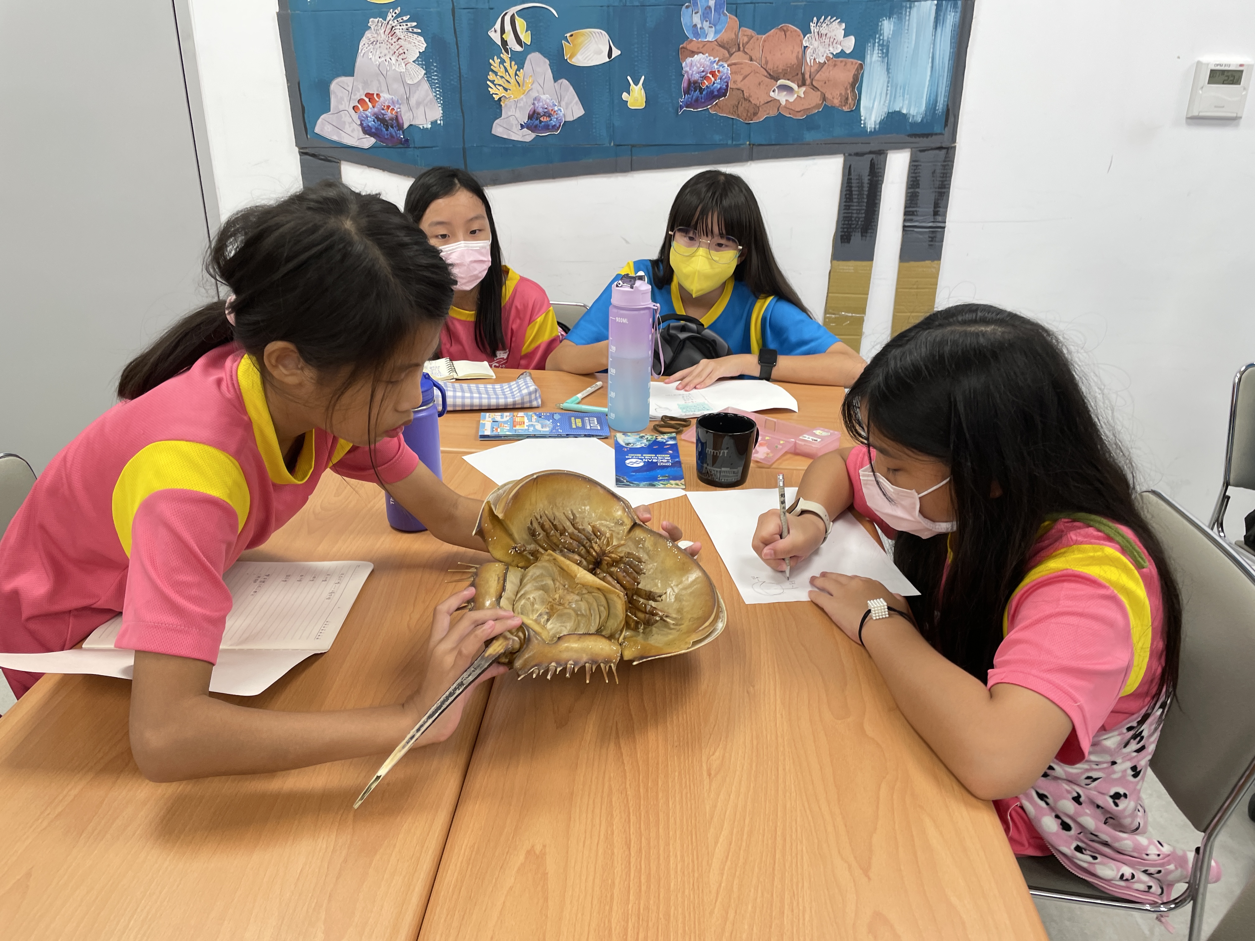 孩子們研究紀錄鱟的標本,養成小小科學家的精神。