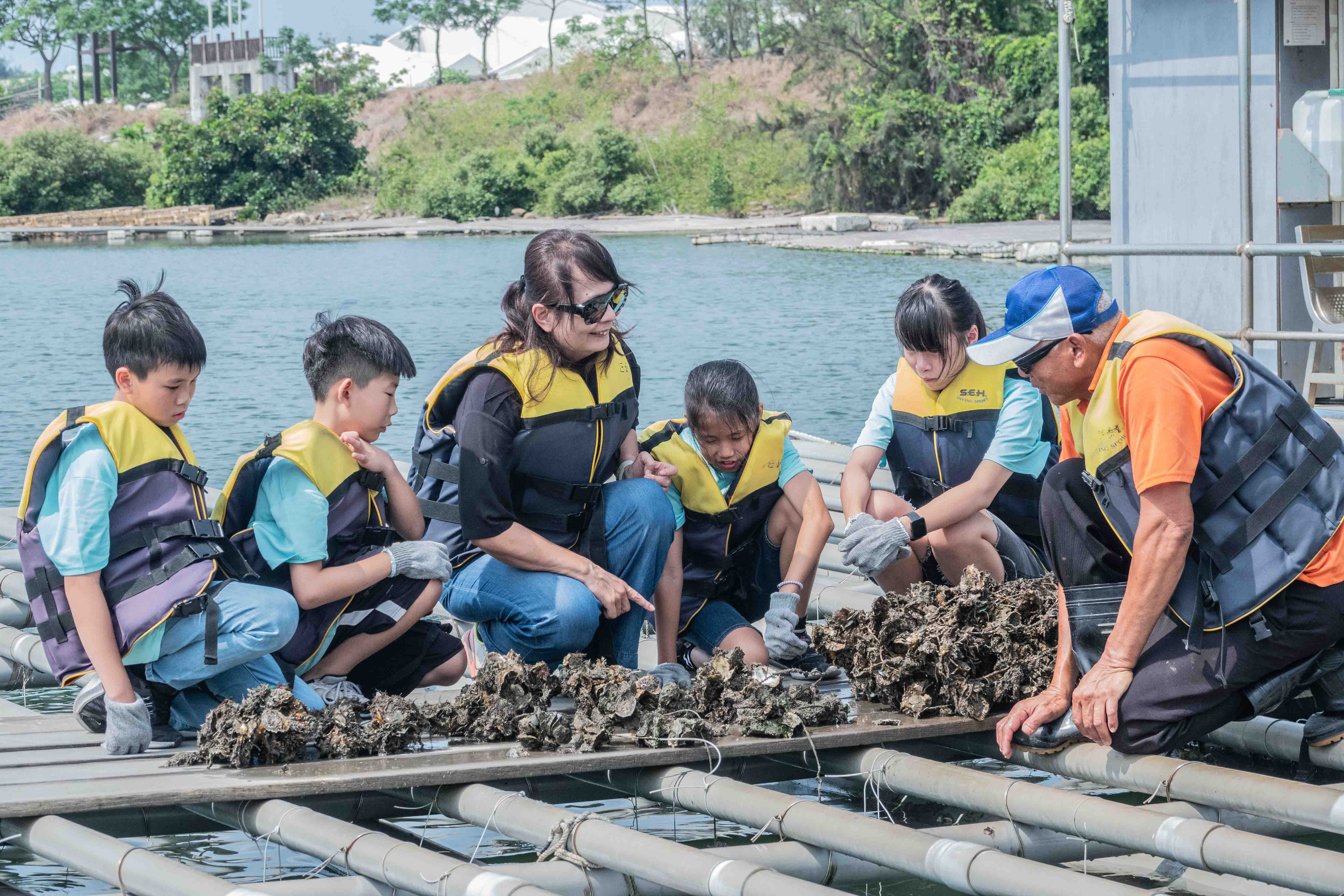 邱馨慧(左三)親自帶孩子到海邊觀察牡蠣的養殖。